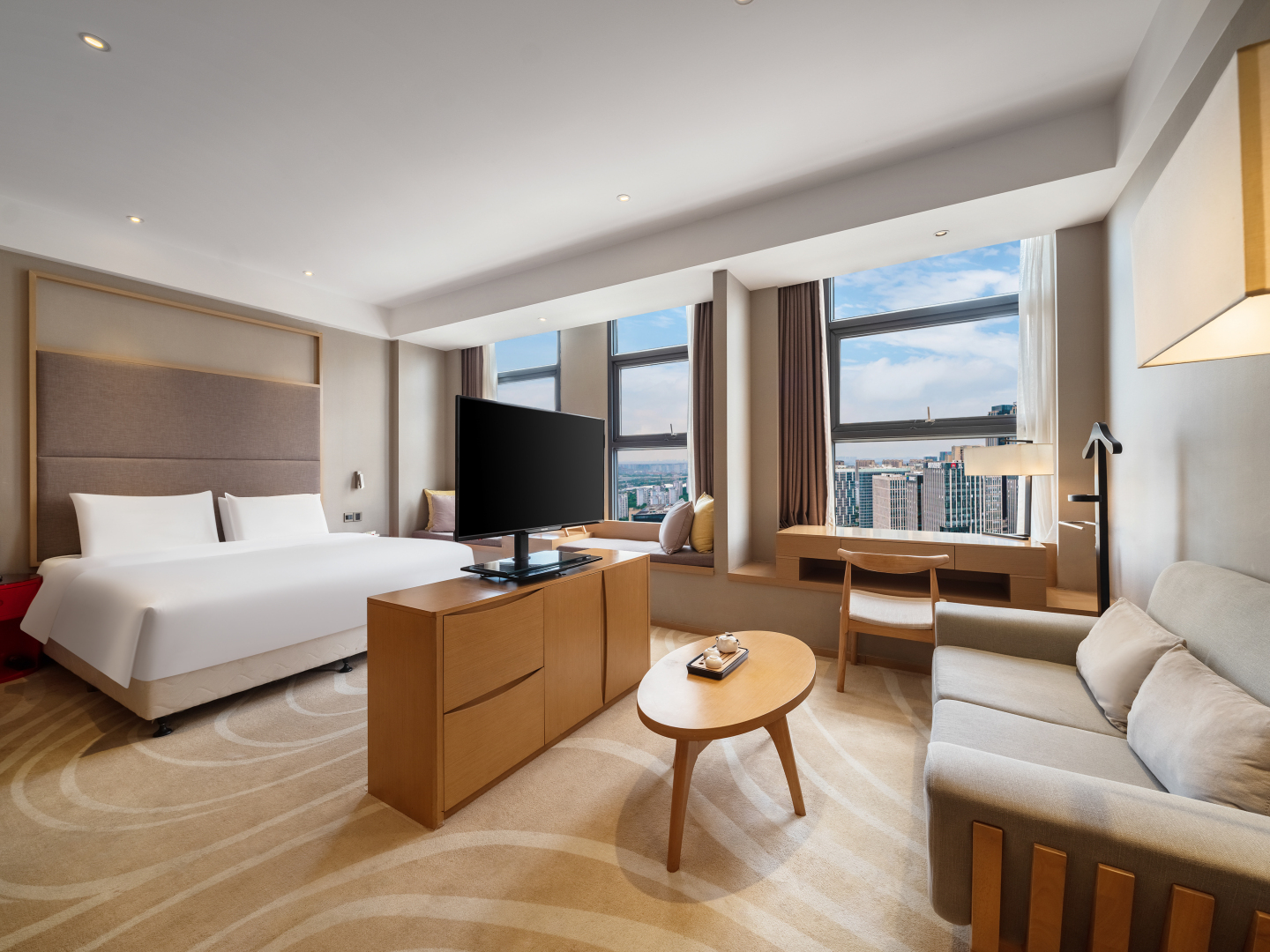 酒店主楼为城市综合体的5-7楼,现代简约的主题建筑风格使之成为这一地区的新地标。酒店配套完备,倾心打造的110间(套)精致的客房,灵动的宴会厅,雅致的中餐包房,现代的会议室,慵懒的茶坊以及服务宾客的健身房、自助洗衣区域等各项配套一应俱全。同时,艺术大师的收藏作品、高级定制家私以及手工研磨咖啡等细节也突显出华美达安可的独特品质。